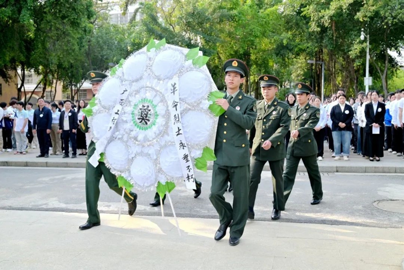 圖為全體師生依次走上瞻仰臺(tái),向革命先烈敬獻(xiàn)小白花
