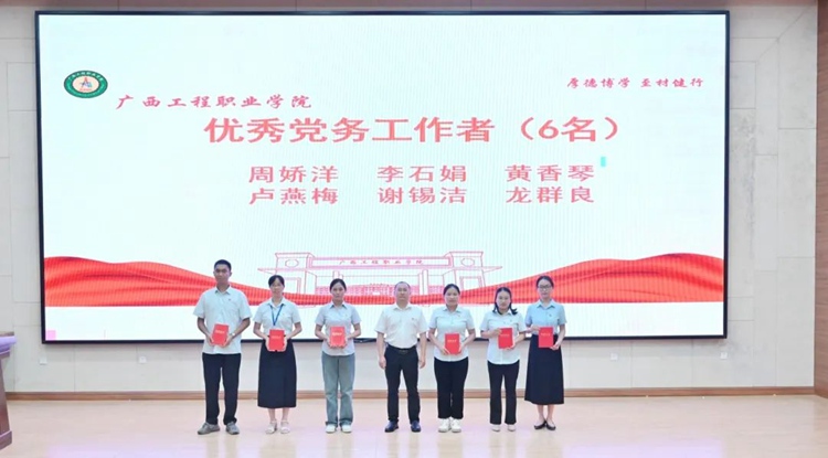 會(huì)上,學(xué)校紀(jì)委書(shū)記、副校長(zhǎng)彭高彬宣讀了《中共廣西工程職業(yè)學(xué)院委員會(huì)關(guān)于表彰優(yōu)秀共產(chǎn)黨員、優(yōu)秀黨務(wù)工作者和先進(jìn)基層黨組織的決定》。與會(huì)學(xué)校黨政領(lǐng)導(dǎo)班子分別為受表彰的優(yōu)秀共產(chǎn)黨員、優(yōu)秀黨務(wù)工作者和先進(jìn)基層黨組織頒獎(jiǎng)。