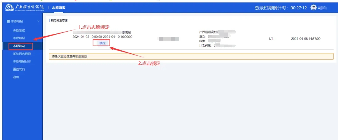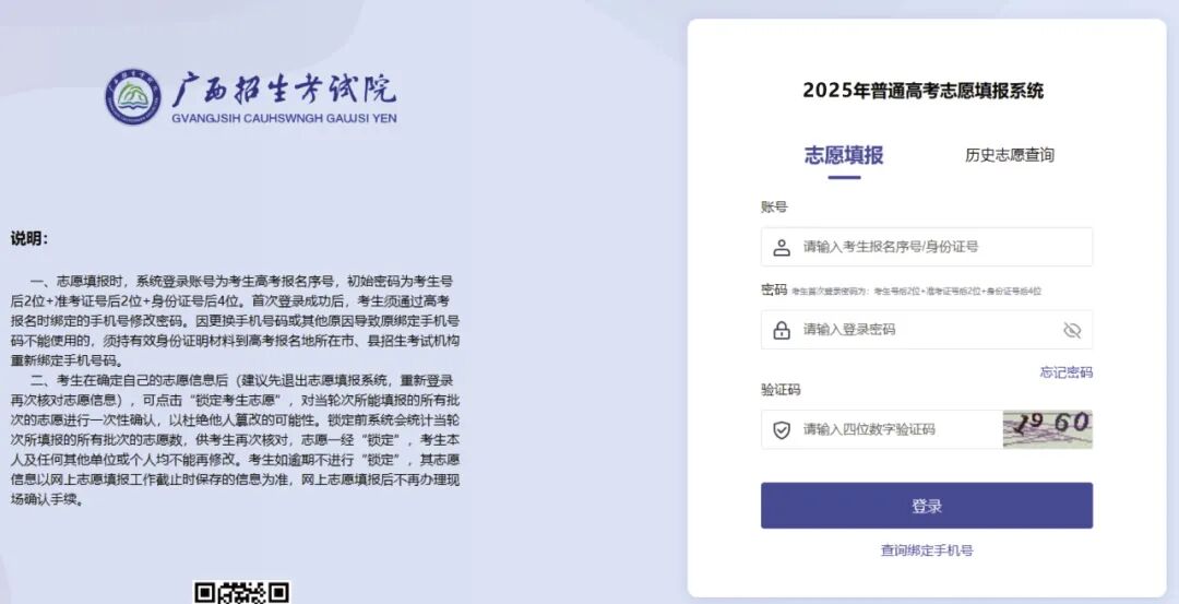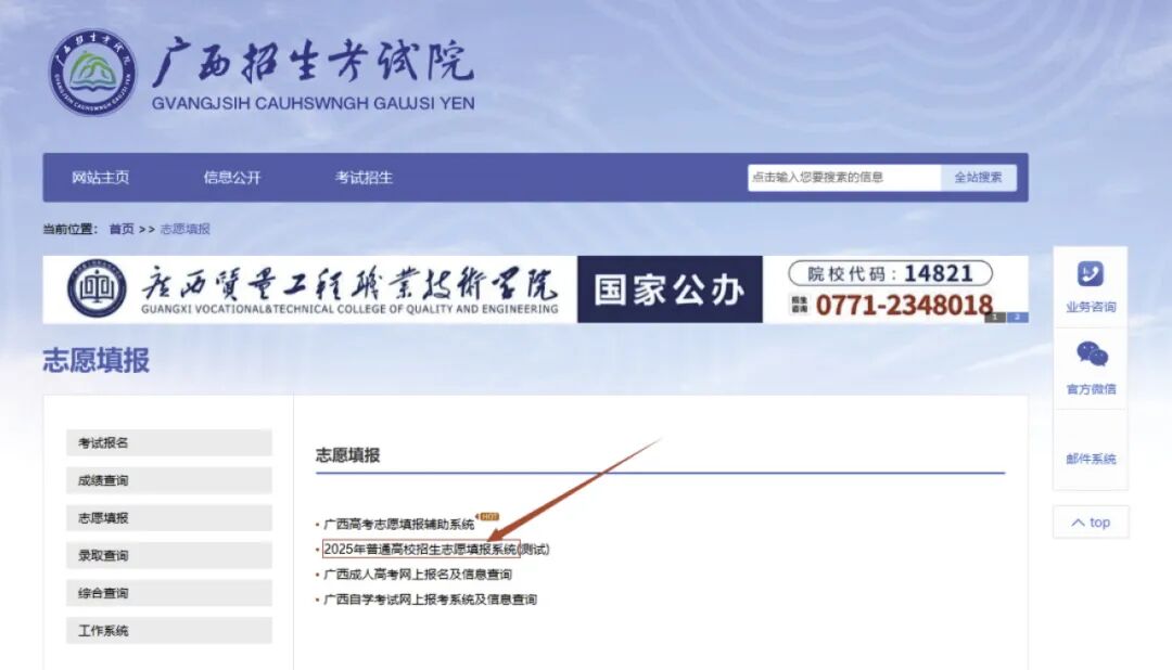 登錄“廣西招生考試院”網(wǎng)站,點擊“志愿填報”欄目,在“2025年普通高校招生志愿填報系統(tǒng)”(以下簡稱志愿填報系統(tǒng))中進行填報?!皬V西招生考試院”網(wǎng)站為填報志愿的唯一網(wǎng)站。