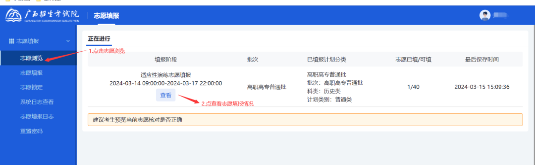 填寫并保存志愿信息后,可點擊“志愿瀏覽”確認信息填寫是否無誤。