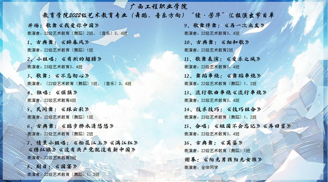 隨著校長助理梁善雅宣布教育學(xué)院2022級藝術(shù)教育專業(yè)(舞蹈、音樂方向)“續(xù)·芳華”匯報(bào)演出正式開始,精彩的匯報(bào)演出拉開了帷幕。本次匯報(bào)演出主要以舞蹈、歌唱、舞臺劇、情景劇等表演形式呈現(xiàn),多角度展示了藝術(shù)專業(yè)同學(xué)們的學(xué)習(xí)成果,展現(xiàn)廣大學(xué)子積極向上的精神風(fēng)貌。