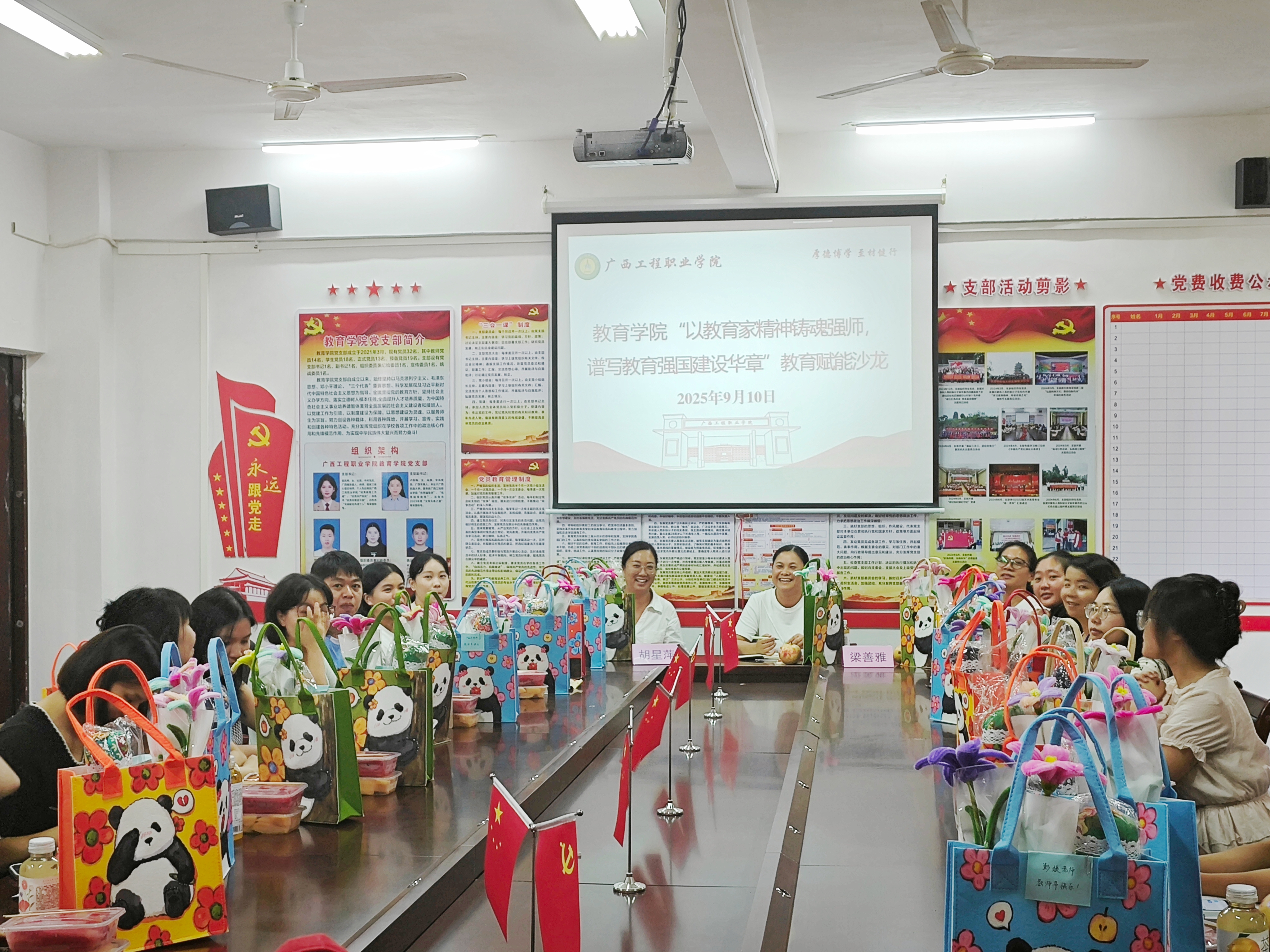 2025年9 月 10 日,廣西工程職業(yè)學(xué)院教育學(xué)院于學(xué)院601會(huì)議室舉辦主題為 “以教育家精神鑄魂強(qiáng)師?譜寫教育強(qiáng)國建設(shè)華章” 的第 41 個(gè)教師節(jié)教育賦能沙龍座談會(huì)。學(xué)校校長助理梁善雅、學(xué)院院長胡星萍、辦公室主任雷紅、黨支部書記楊小櫻、學(xué)生科長佴蕊以及教育學(xué)院全體教師出席座談會(huì)?;顒?dòng)伊始,學(xué)院領(lǐng)導(dǎo)發(fā)表講話,強(qiáng)調(diào)教育家精神對(duì)教育工作者的重要引領(lǐng)作用,鼓勵(lì)教師們?cè)诮逃龔?qiáng)國建設(shè)中積極作為。?