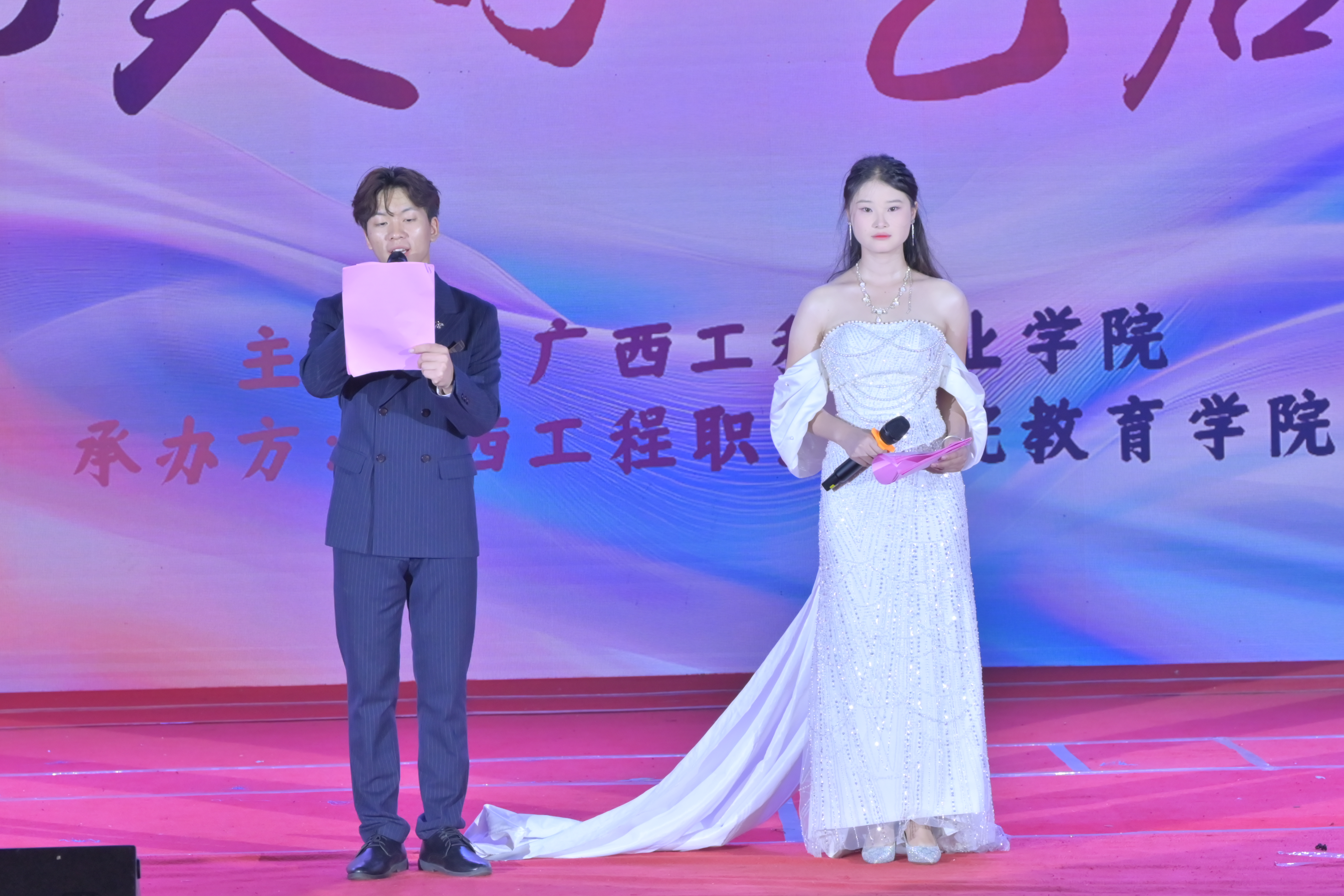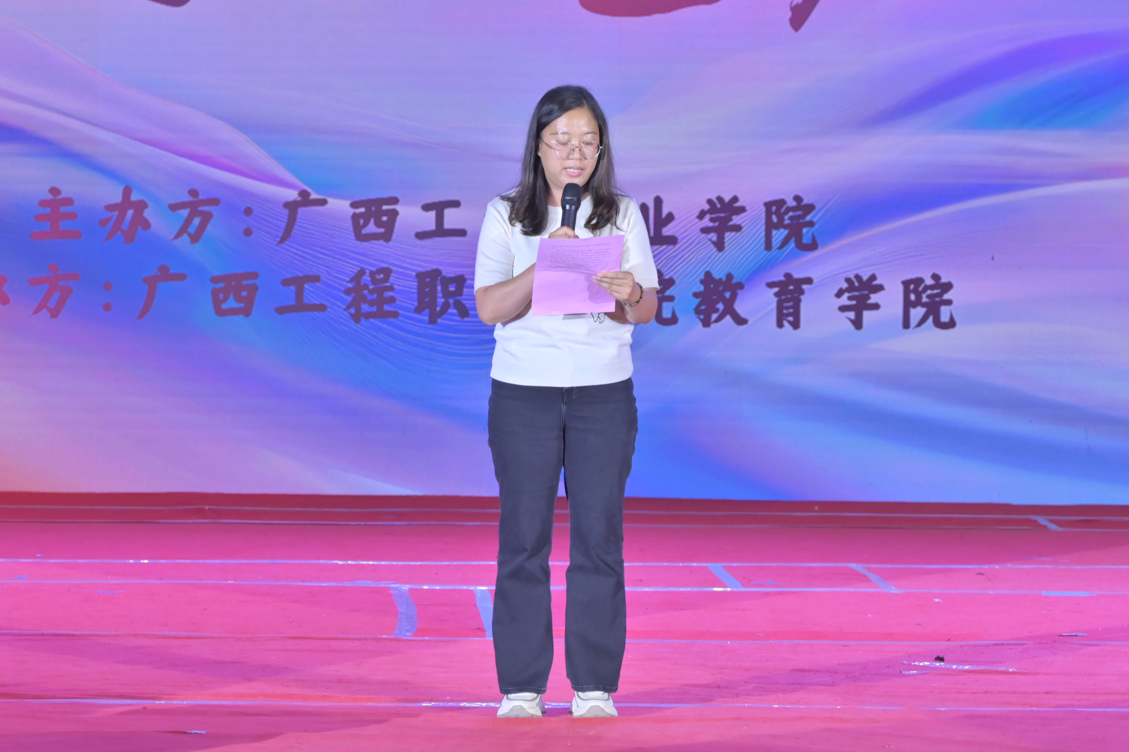 教育學(xué)院院長(zhǎng)胡星萍致辭。她表示,在這充滿希望與活力的美好時(shí)節(jié),我們齊聚廣西工程職業(yè)學(xué)院體育館,共同迎來教育學(xué)院2023 級(jí)學(xué)前教育、藝術(shù)教育、嬰幼兒托育服務(wù)與管理專業(yè)“育見美好?藝啟綻放”教學(xué)成果匯報(bào)展演。本次匯報(bào)演出,是教育學(xué)院落實(shí)專業(yè)人才培養(yǎng)目標(biāo)的重要實(shí)踐,也是對(duì)2023級(jí)學(xué)子學(xué)習(xí)成果的全面檢驗(yàn),有著多重深遠(yuǎn)目的。對(duì)學(xué)生而言,這是一個(gè)將課堂所學(xué)轉(zhuǎn)化為實(shí)踐成果的絕佳平臺(tái)。通過舞臺(tái)表演、技能展示等多元形式,不僅能全面檢驗(yàn)他們?cè)趯I(yè)理論知識(shí)、藝術(shù)技能、保教實(shí)踐等方面的學(xué)習(xí)成效,還能鍛煉他們的舞臺(tái)表現(xiàn)力、團(tuán)隊(duì)協(xié)作能力和臨場(chǎng)應(yīng)變能力,為未來踏入職場(chǎng)積累寶貴經(jīng)驗(yàn)。每一個(gè)節(jié)目從構(gòu)思到成型,每一次排練從生疏到嫻熟,都凝聚著同學(xué)們的智慧與堅(jiān)持。從專業(yè)發(fā)展角度出發(fā),此次活動(dòng)能夠充分彰顯教育學(xué)院這三大專業(yè)的特色與優(yōu)勢(shì)。每一個(gè)節(jié)目、每一次展示,都是專業(yè)教學(xué)成果的生動(dòng)體現(xiàn),讓我們清晰看到專業(yè)人才培養(yǎng)的方向與成果,為進(jìn)一步優(yōu)化課程設(shè)置、深化教學(xué)改革提供依據(jù)。此外,希望通過這場(chǎng)演出,增進(jìn)社會(huì)、家長(zhǎng)及師生對(duì)專業(yè)的認(rèn)知與認(rèn)同。打破外界對(duì)這些專業(yè)的固有認(rèn)知誤區(qū),展示專業(yè)的深度與廣度,吸引更多有志之士投身相關(guān)領(lǐng)域,同時(shí)也為深化產(chǎn)教融合奠定堅(jiān)實(shí)基礎(chǔ),加強(qiáng)與行業(yè)企業(yè)的溝通合作,培養(yǎng)出更貼合市場(chǎng)需求的高素質(zhì)應(yīng)用型人才。
