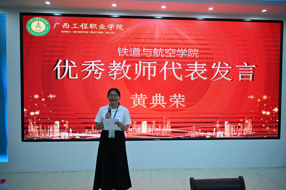 緊接著,優(yōu)秀教師代表黃典榮發(fā)言,她對學(xué)校的精心栽培表示衷心的感謝,并如何激發(fā)學(xué)生的主動性與創(chuàng)造力以及如何引導(dǎo)學(xué)生樹立正確的價值觀和職業(yè)觀兩方面分享了自己的優(yōu)秀教學(xué)方法,力求與各位同仁攜手并進,為培養(yǎng)更多高素質(zhì)技術(shù)技能人才貢獻自己的力量。