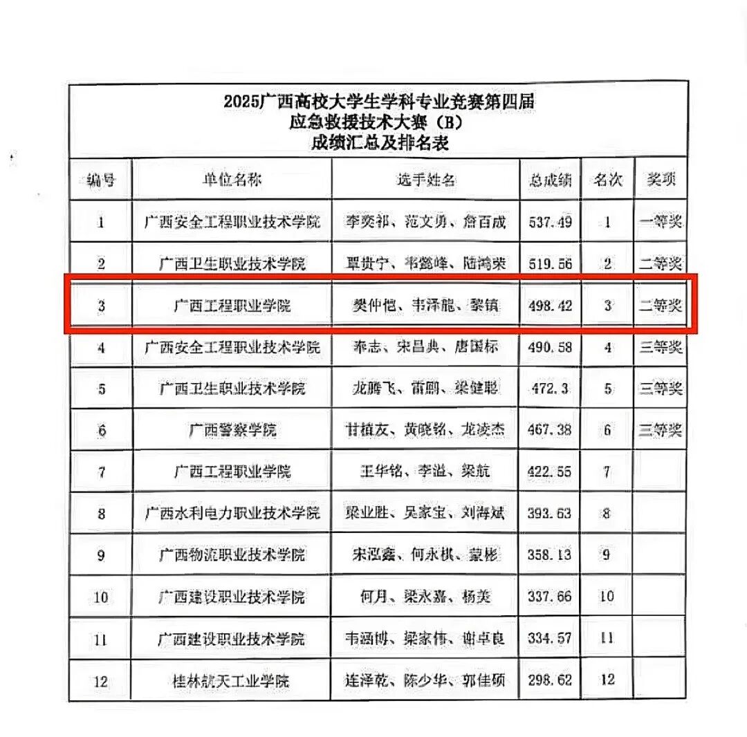 近日,由自治區(qū)教育廳、自治區(qū)應急管理廳指導,廣西安全工程職業(yè)技術(shù)學院等單位承辦的2025年廣西高校大學生學科專業(yè)競賽第四屆應急救援技術(shù)大賽圓滿落幕。我院組織2支隊伍參加應急救援技能(B)賽項。最終,在來自全區(qū)9所高職院校的12支代表隊激烈角逐中,由黎鎮(zhèn)、韋澤龍、樊仲愷三名同學組成的代表隊脫穎而出,他們憑借扎實的專業(yè)功底和出色的應急處置能力,斬獲該賽項二等獎。