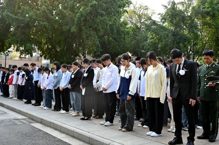 (二)深切緬懷16:30,緬懷儀式正式開始。在莊嚴(yán)肅穆的革命烈士紀(jì)念碑前,師生列隊(duì)肅立,向革命先烈敬獻(xiàn)小白花,全體默哀一分鐘,表達(dá)對革命先烈的無限哀思和崇高敬意。