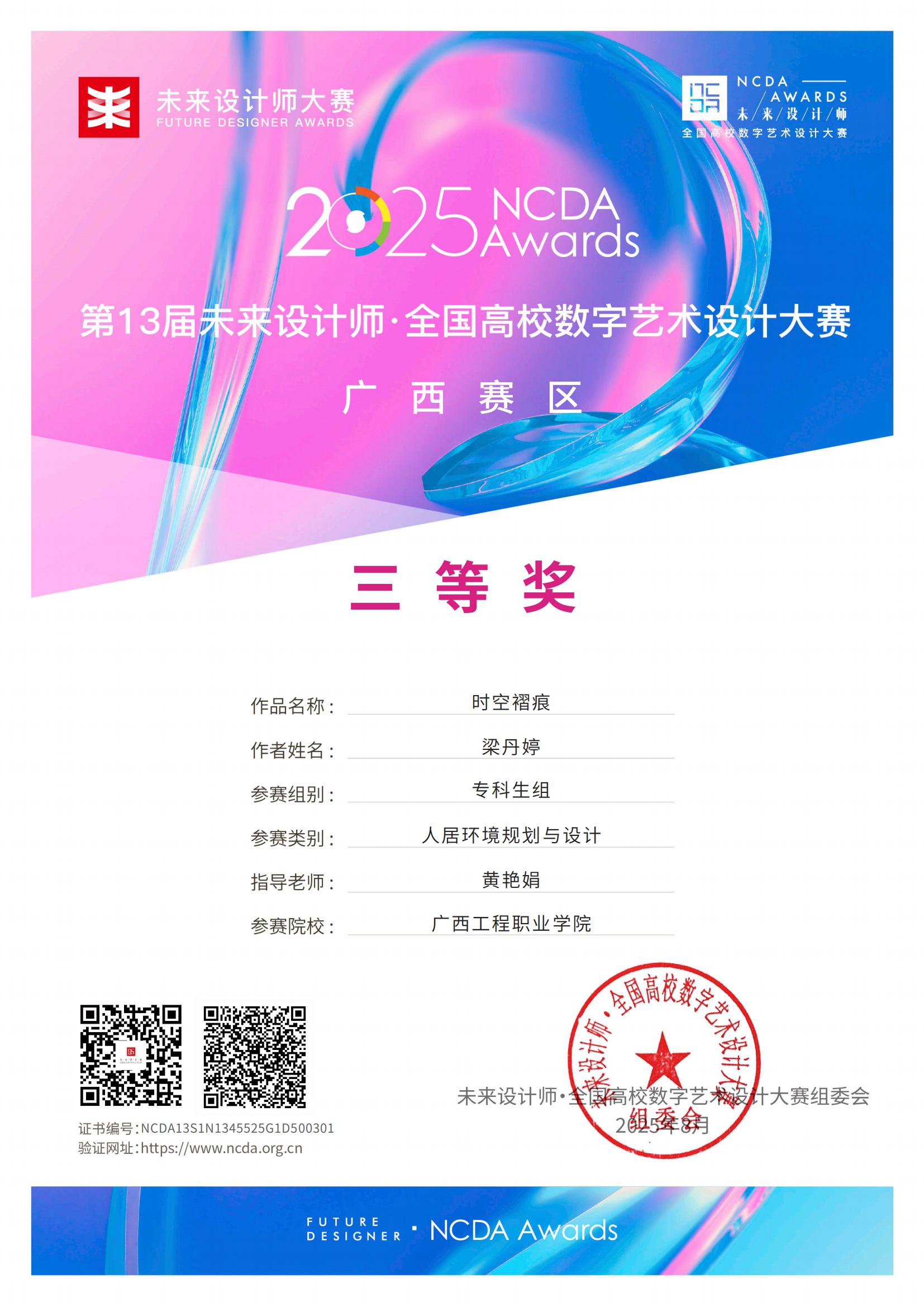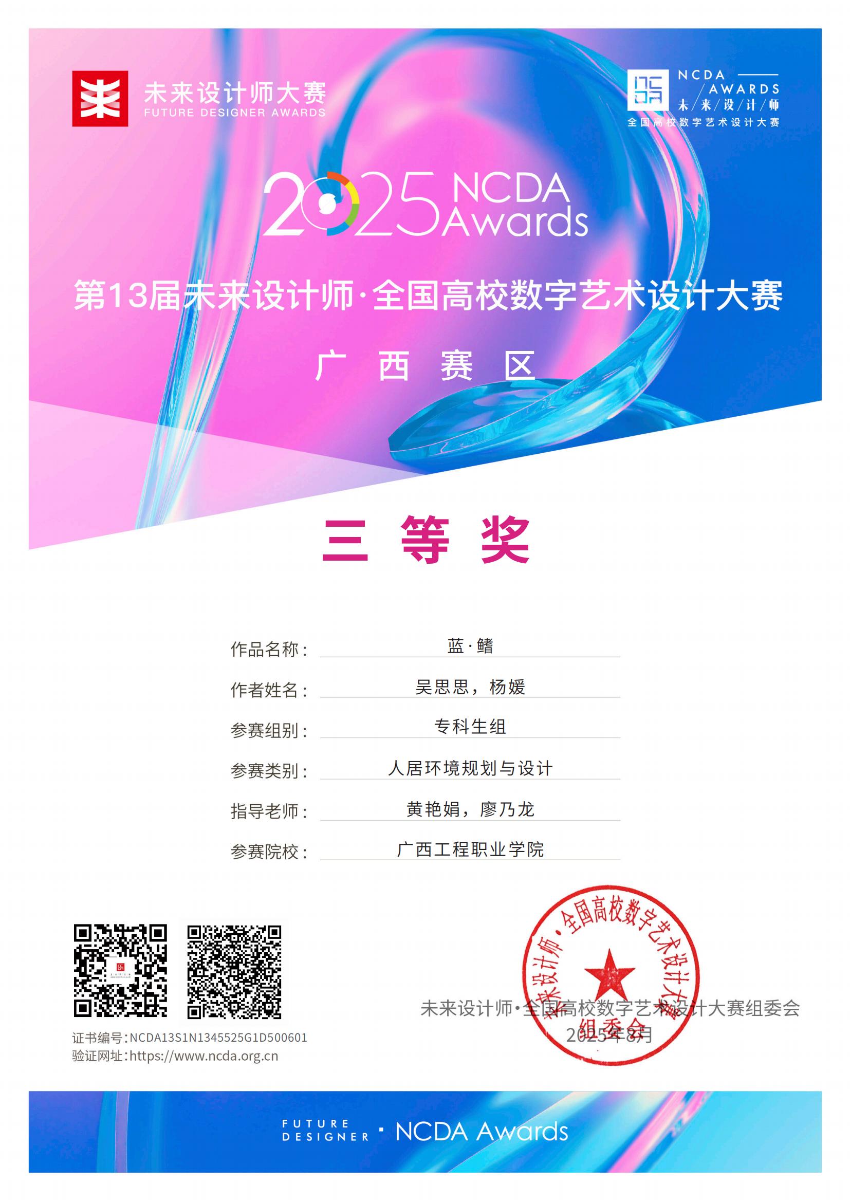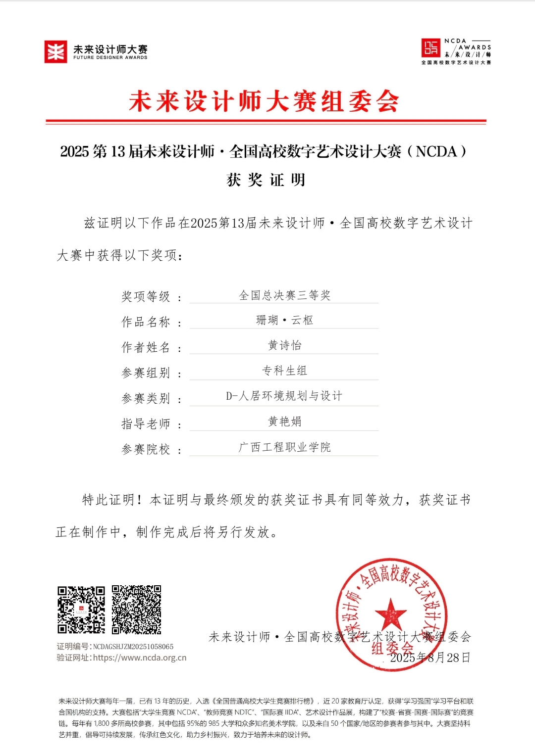 近日,2025年第13屆未來設(shè)計師·全國高校數(shù)字藝術(shù)設(shè)計大賽(NCDA)評選結(jié)果揭曉。廣西工程職業(yè)學(xué)院藝術(shù)設(shè)計學(xué)院學(xué)生表現(xiàn)優(yōu)異,共斬獲全國總決賽三等獎1項、廣西賽區(qū)一等獎1項、廣西賽區(qū)二等獎1項、廣西賽區(qū)三等獎2項。黃艷娟、譚雪融兩位教師榮獲“優(yōu)秀指導(dǎo)教師”稱號。