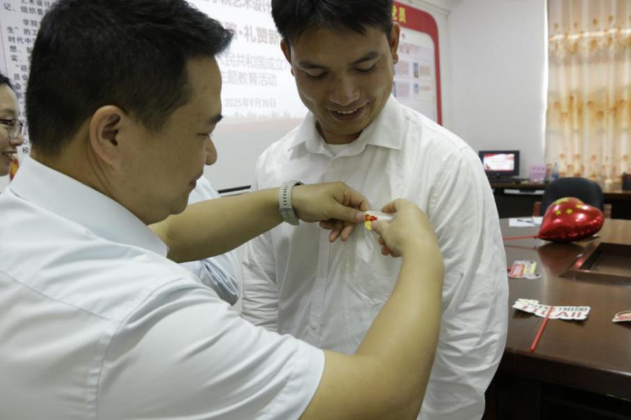 2025年9月30日下午,藝術設計學院黨支部在學院三樓黨員活動室開展了“76載輝煌路·禮贊新時代”慶祝中華人民共和國成立76周年主題教育活動。學院全體教師參加本次主題教育活動,活動由黨支部書記覃鳳姣同志主持,本次會議包含黨支部書記講黨課、老黨員給新黨員佩戴黨員徽章、黨支部書記領誓、同唱紅歌等四個環(huán)節(jié)。
