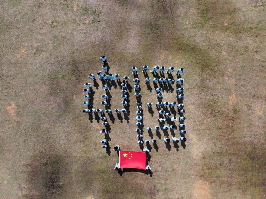 圖為學生在校內田徑場內默契配合擺出“中國”字樣