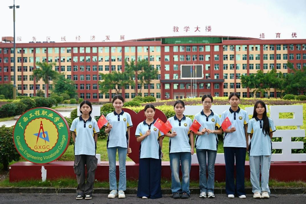 校園內外的雙節(jié)景致同樣成為學子們的“創(chuàng)作素材”。如校內田徑場內默契配合擺出“76”與“中國”字樣,無人機升空盤旋,將這一飽含敬意的畫面定格,紅色身影與藍色天空相映,成為獻給祖國的獨特賀禮;2024級廣告藝術設計1、2班的同學們手持鮮艷國旗,穿梭于魯班廣場與西門“Love工程”地標;2024級產品藝術設計1班聚焦“我眼中的國慶”,漫步街頭捕捉紅色元素——商鋪前飄揚的國旗、路燈上懸掛的雙節(jié)裝飾、廣場里的國慶主題布置,每一張照片都藏著城市對家國的祝福;2024級美容美體藝術1班則走進鄧公山、平果人民政府等地,與紅色文化地標合影,在感受祖國發(fā)展變遷的同時,也以特殊方式為雙節(jié)“打卡”,讓家國情懷在實地探訪中愈發(fā)深刻。