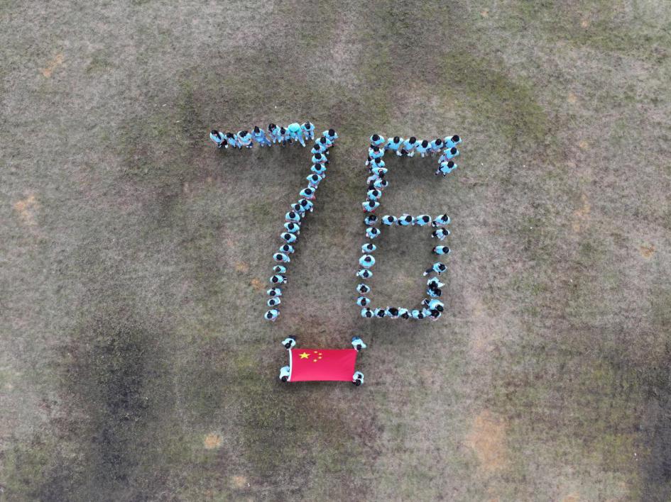 圖為學生在校內田徑場內默契配合擺出“76”字樣