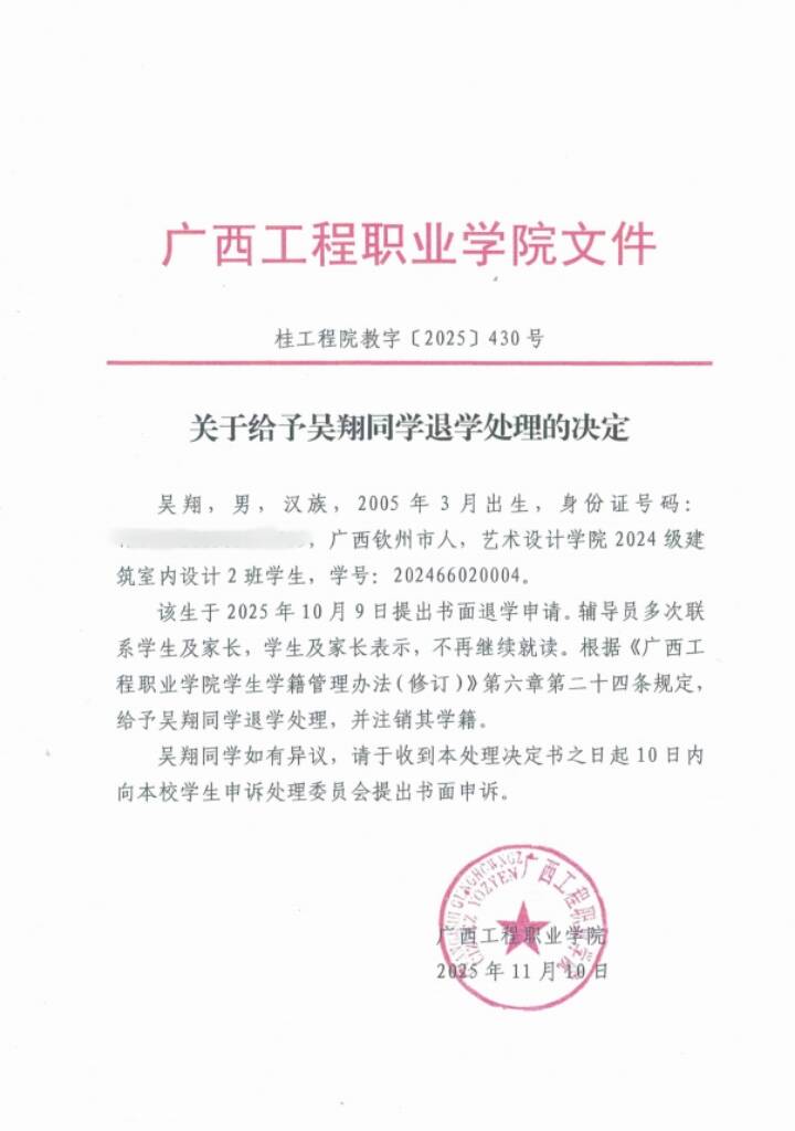 根據(jù)《普通高等學(xué)校學(xué)生管理規(guī)定》(教育部令第41號(hào))《廣西工程職業(yè)學(xué)院學(xué)生學(xué)籍管理辦法(修訂)》第二十四規(guī)定,給予吳翔同學(xué)退學(xué)處理,同時(shí)注銷其學(xué)籍。