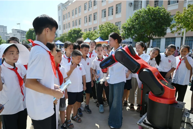 工業(yè)機(jī)器人展區(qū)儼然成為小學(xué)生們的 “科技樂園”。專業(yè)教師與學(xué)生志愿者帶領(lǐng)孩子們開展“機(jī)器人小互動”活動,讓孩子們在趣味體驗(yàn)中感受工業(yè)機(jī)器人的科技魅力。