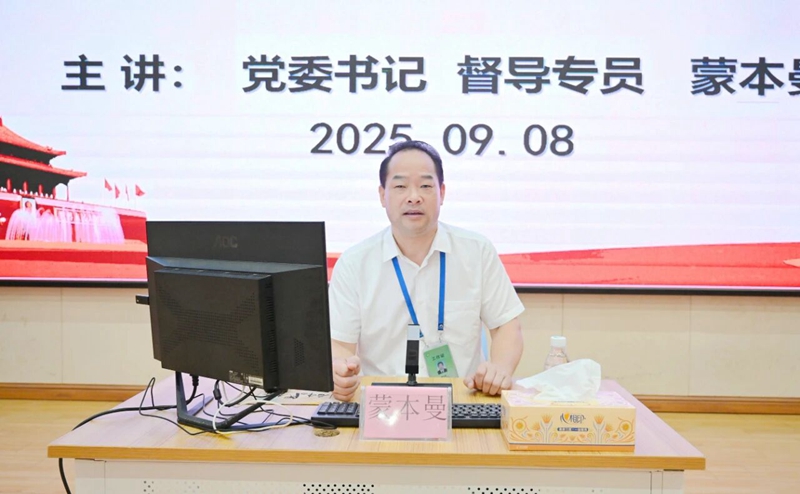 圖為黨委書記、督導專員蒙本曼作《師德師風第一課——深刻認識意識形態(tài)工作極端重要性 全力打造“大思政課”育人格局》專題培訓