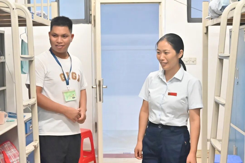 圖為學校黨委副書記黃秋霞走進學生宿舍與學生交談