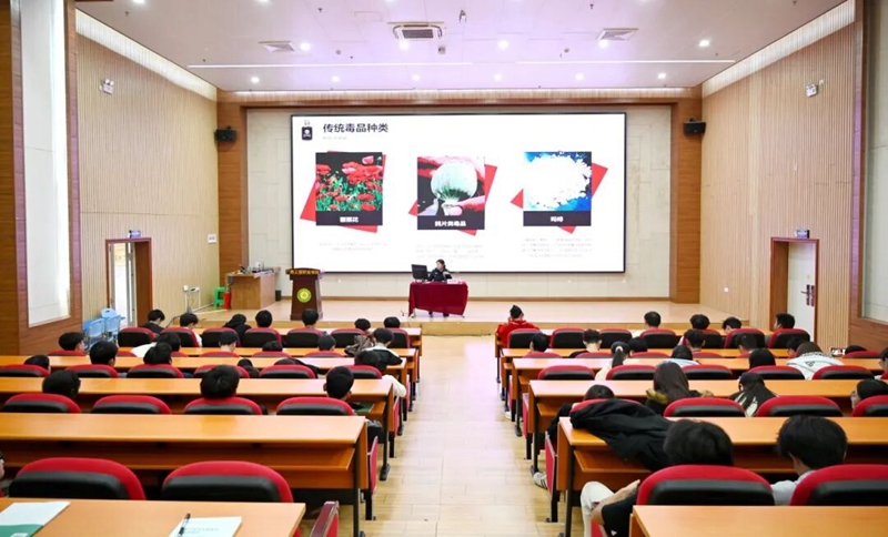 黃雪嬌警官通過圖片的形式向同學(xué)們展示了新型毒品的主要種類以及制作毒品的原材料,同時以視頻的形式展現(xiàn)了吸毒對社會治安造成的嚴(yán)重危害。深入淺出地向同學(xué)們介紹了吸毒給身心健康帶來的嚴(yán)重影響,以及販毒所承受的刑事責(zé)任。她強(qiáng)調(diào),無論是吸毒還是販毒都是我們大學(xué)生不可觸碰的“紅線”,同時需要警惕身邊存在的吸毒販毒等行為,提高自己的防范意識。