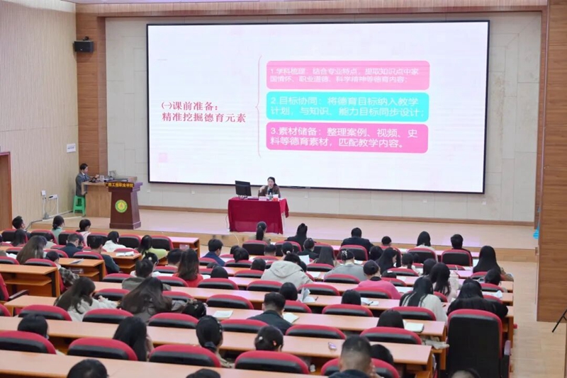 培訓(xùn)中,黃秋霞副書記結(jié)合各二級學(xué)院專業(yè)特色,分享了德育滲透的實踐方向。比如,教育學(xué)院可以將師德規(guī)范與職業(yè)素養(yǎng)融入師范實訓(xùn);經(jīng)濟(jì)管理學(xué)院可以把誠信守法、商業(yè)倫理植入財經(jīng)教學(xué);汽車與機(jī)電學(xué)院要在工科實訓(xùn)中培育工匠精神與勞動精神;鐵道與航空學(xué)院要緊扣行業(yè)規(guī)范強(qiáng)化敬業(yè)服務(wù)意識;土木工程學(xué)院可以將工程責(zé)任與環(huán)保理念融入專業(yè)課程;藝術(shù)設(shè)計學(xué)院要以文化自信與原創(chuàng)精神賦能設(shè)計教學(xué)。她還特別厘清學(xué)科德育元素融入與課程思政的關(guān)系,為教師精準(zhǔn)實踐提供理論指引。