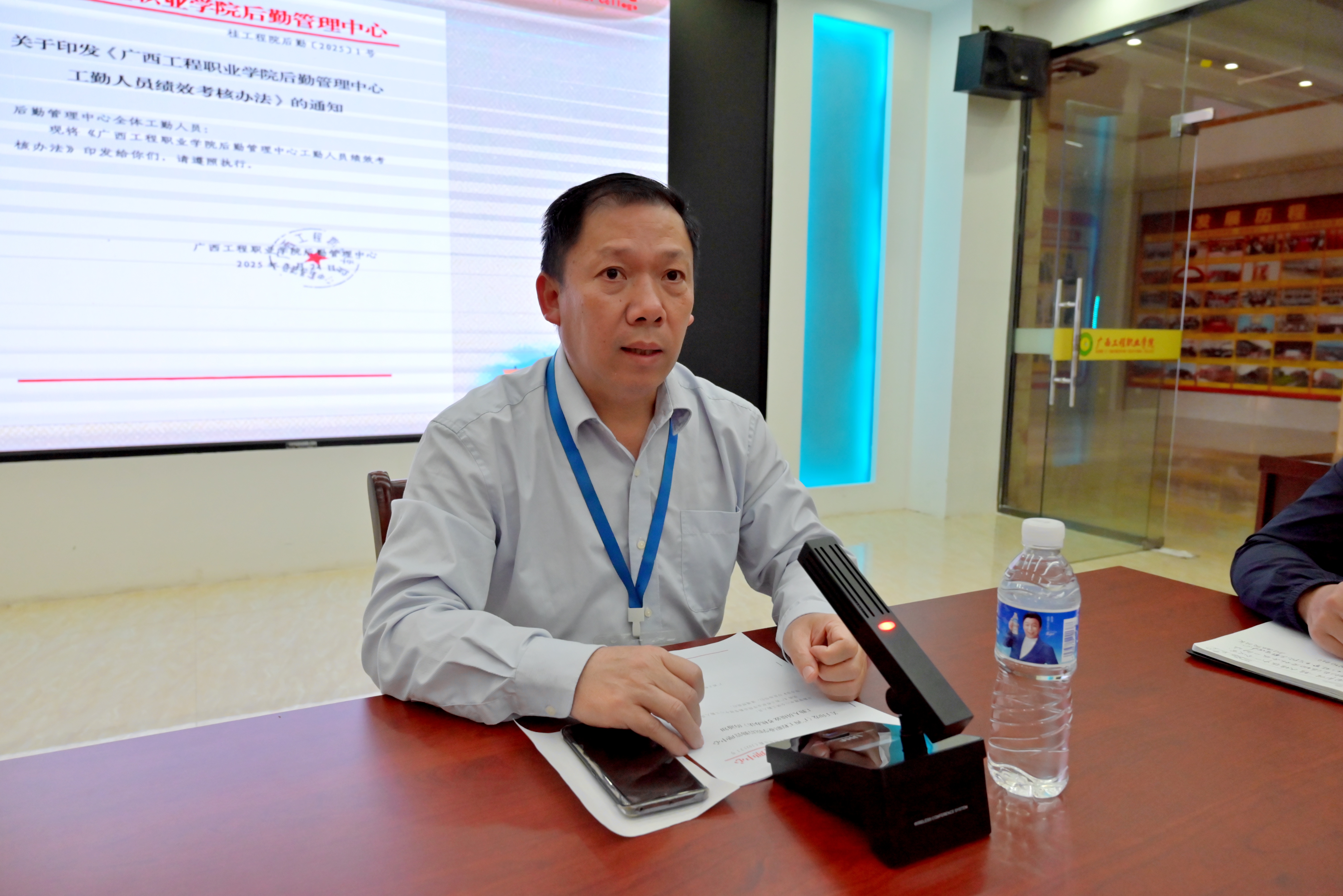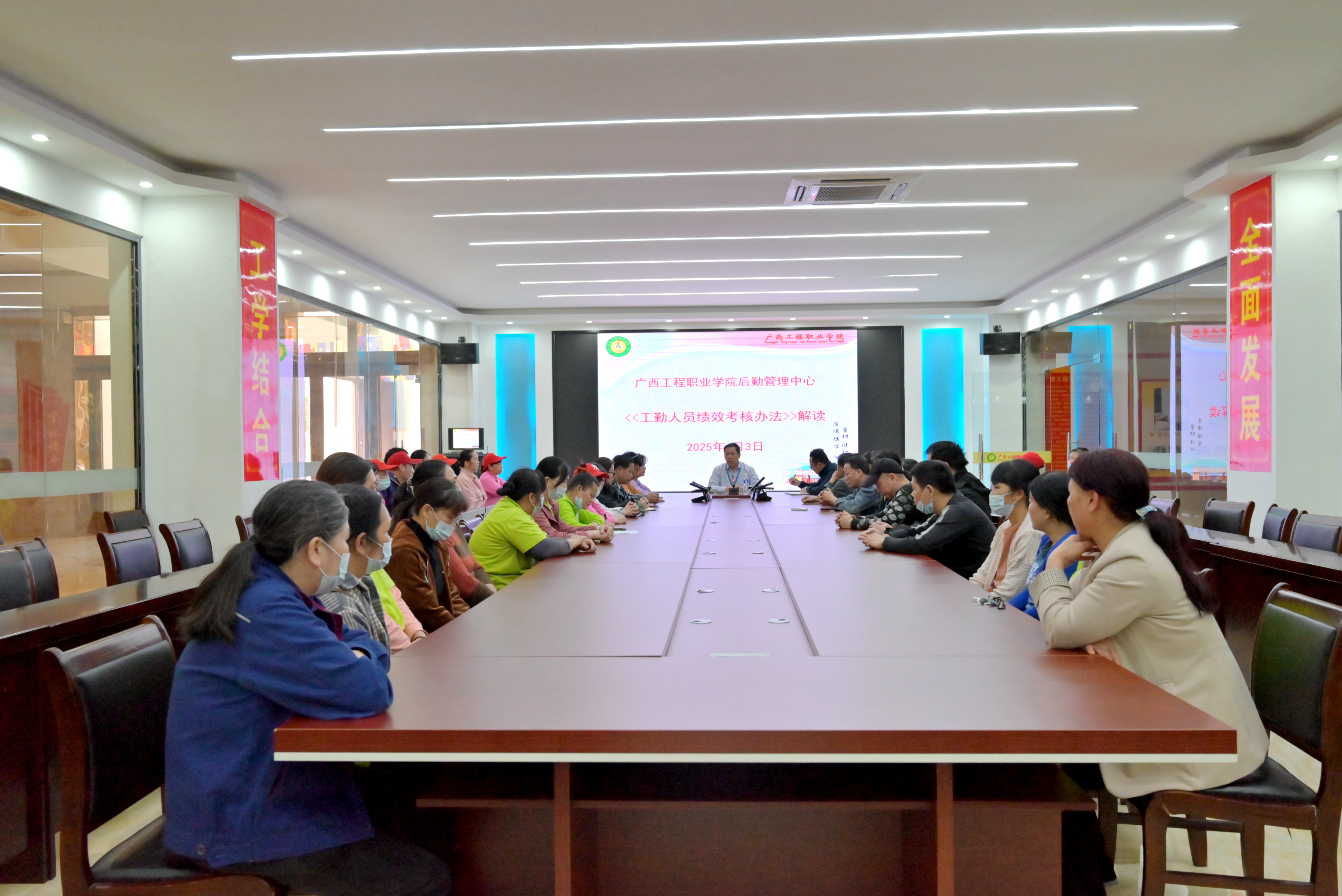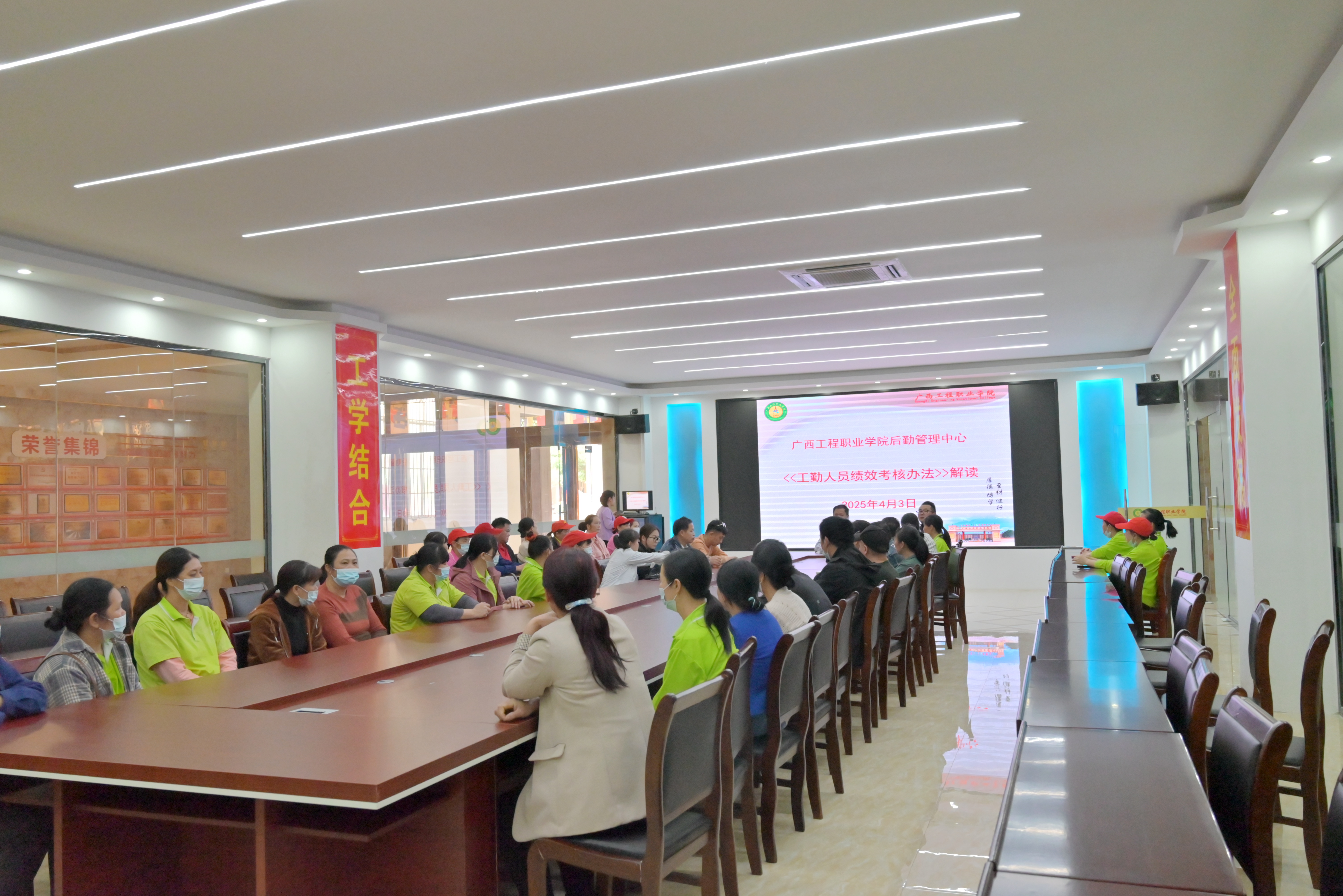 為進一步規(guī)范工勤人員績效考核管理,提升工作效能和服務水平,我校后勤管理中心于4月3日在圖書館會議室召開了《工勤績效考核辦法》專題解讀會議。會議由后勤管理中心負責人劉兆兵主任主持召開,水電保潔綠化科科長李德勝、膳食科科長黃桂芬及全體工勤人員參加了會議。