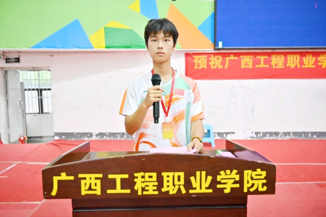 運(yùn)動員代表余彬同學(xué)發(fā)言。他將秉持“友誼第一,比賽第二”的原則,全力以赴。他表示,全體運(yùn)動員將以拼搏姿態(tài)書寫青春,用堅(jiān)韌意志挑戰(zhàn)極限,在賽場嚴(yán)守規(guī)則、尊重裁判對手,既賽出競技水平,更賽出體育道德。無論勝負(fù),都將在切磋中收獲成長與快樂,以精湛球技呈現(xiàn)精彩對決,共享羽毛球運(yùn)動魅力,用汗水為體育精神添彩!